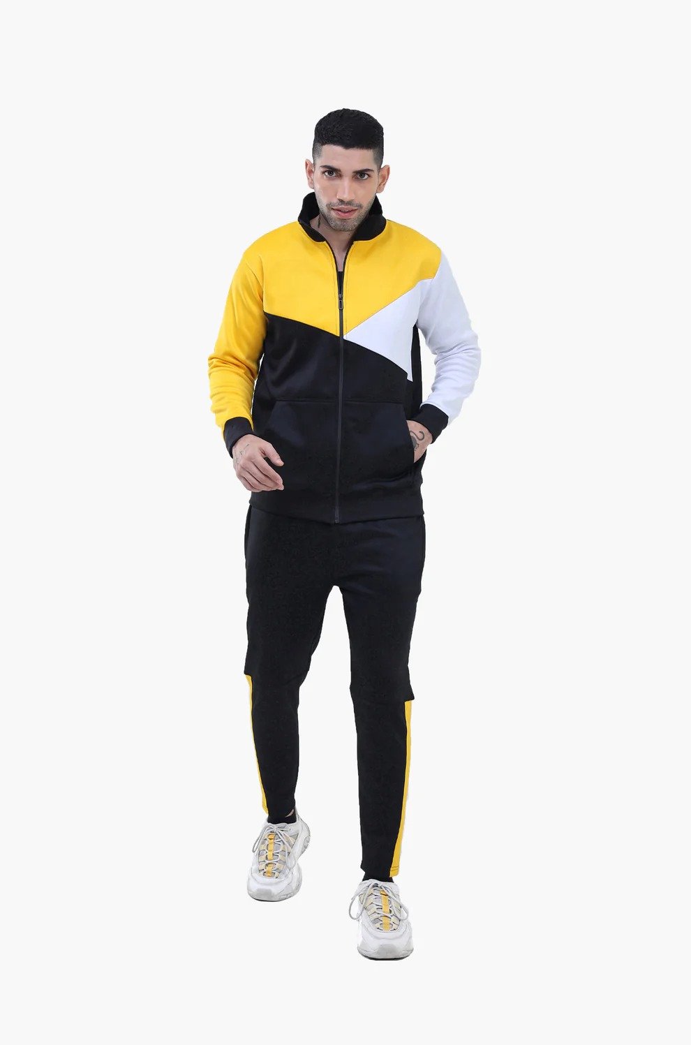 The zip-up jacket features a sleek black base with vibrant yellow panels that add a bold edge to your look, while the matching joggers provide a tailored yet relaxed fit. Whether you’re heading to the gym, running errands, or just chilling with friends, this tracksuit keeps your outfit effortlessly on point.